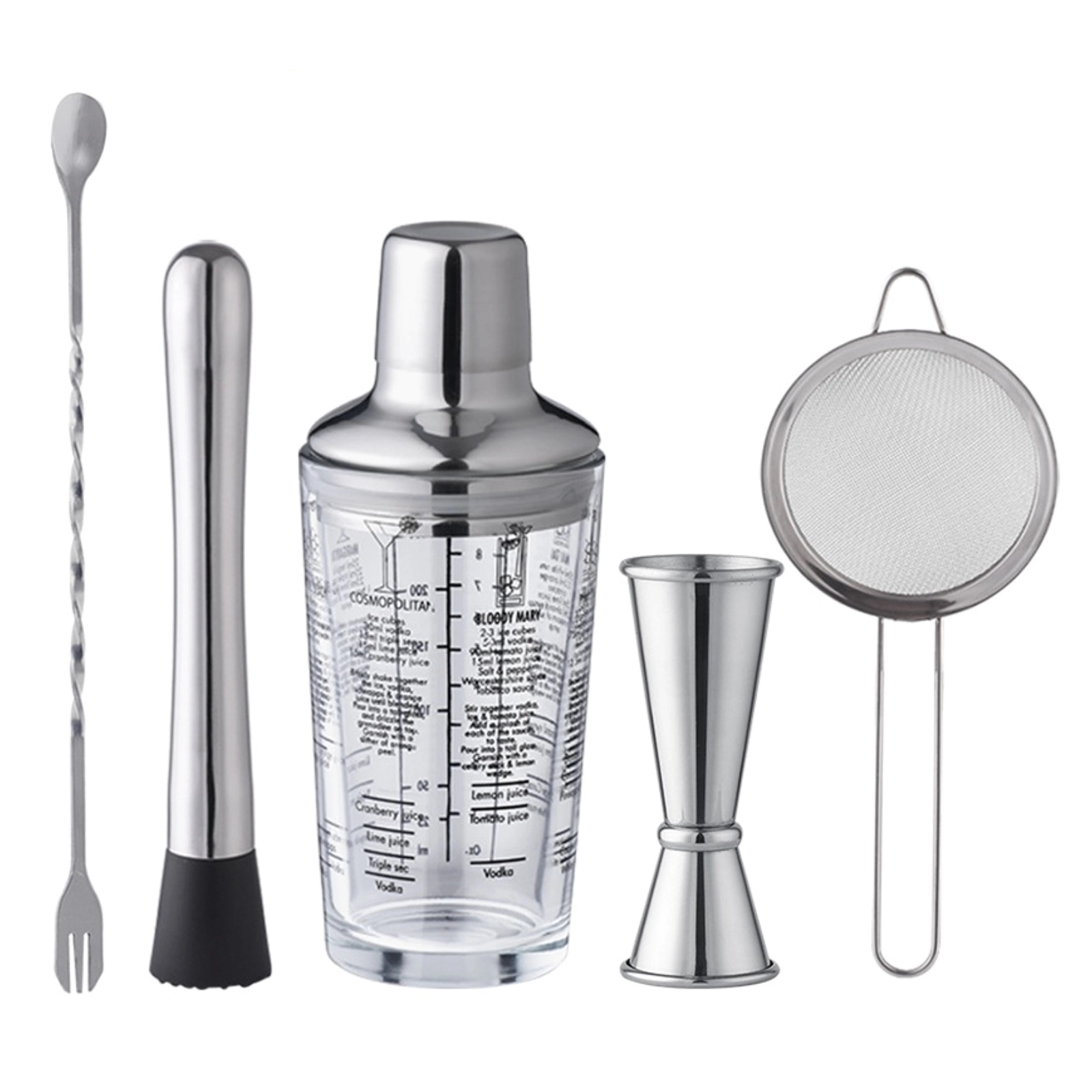 This bartender kit contains a shaker, a double measuring cup, a crushed popsicle, a bartender strainer and a bar spoon.