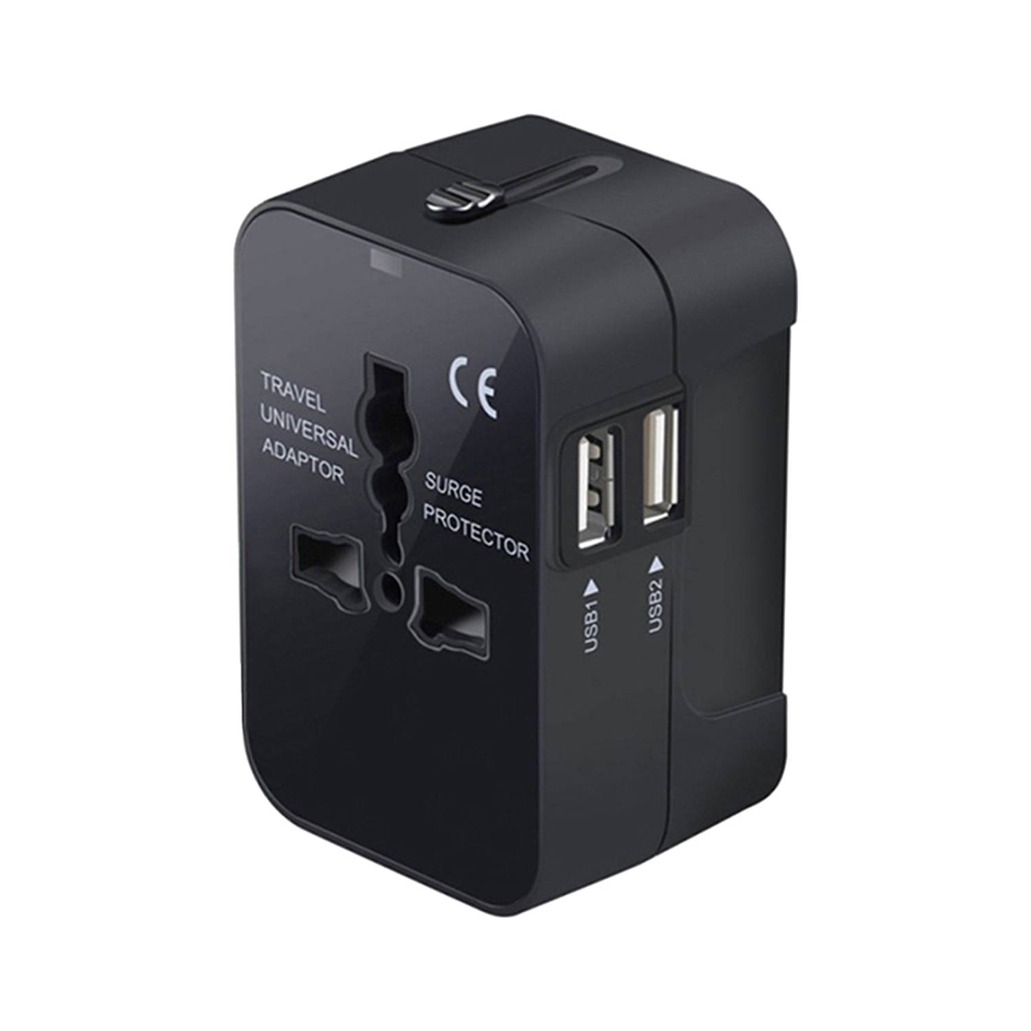 Compact global adapter 3″ dual USB for over 180 countries with surge protection.