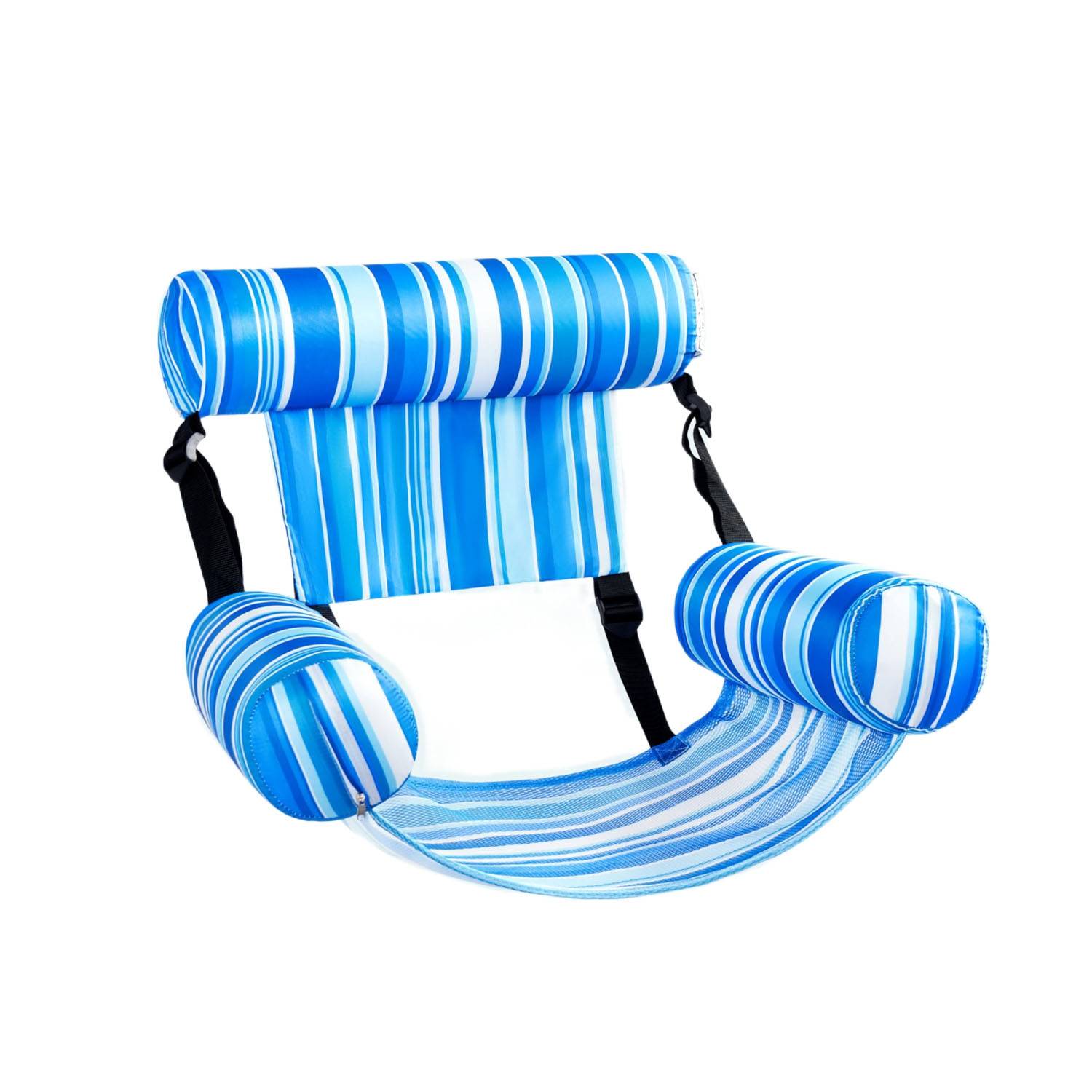 Inflatable pool float with adjustable support, soft fabric, PVC, safe and comfy—perfect for beach, travel, or pool relaxation.