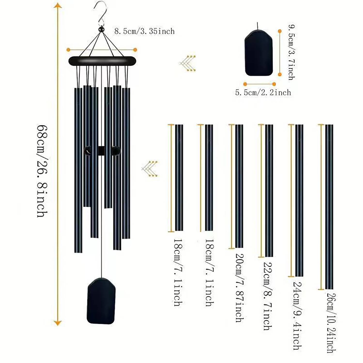 Aluminum wind chimes with wooden accents, crisp sound, durable, safe, perfect for decorating living rooms or balconies.