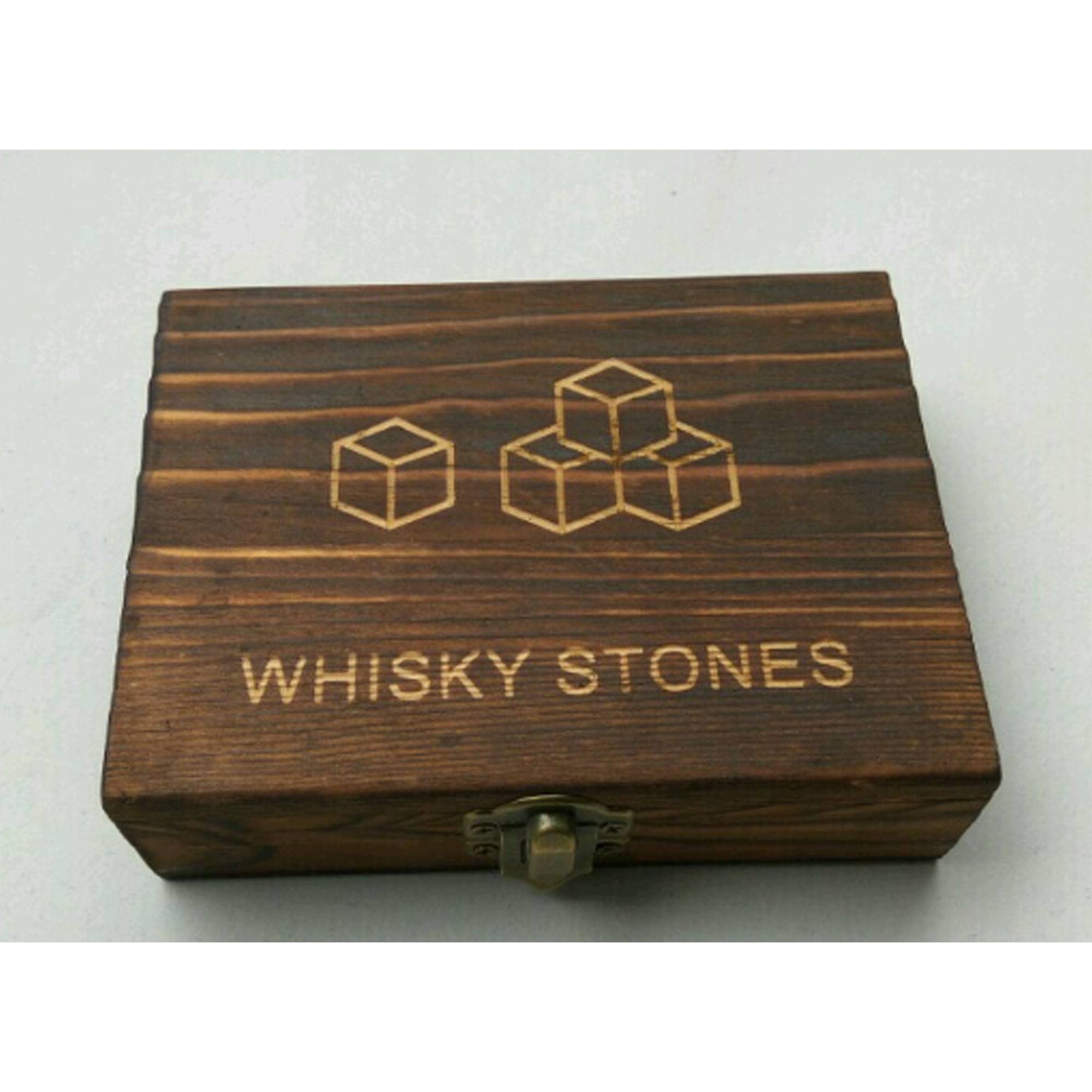 Wine stone set in a wooden box with six stones and a velvet pouch, perfect for chilling whisky.