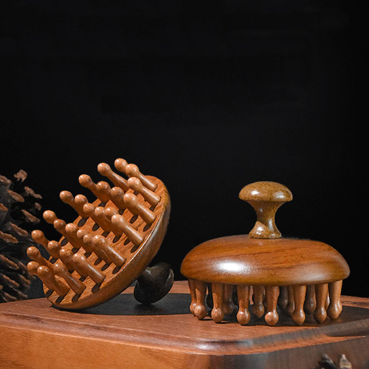 Natural wood scalp massager with ergonomic design, smooth nodes for stress relief, improves circulation, eco-friendly.