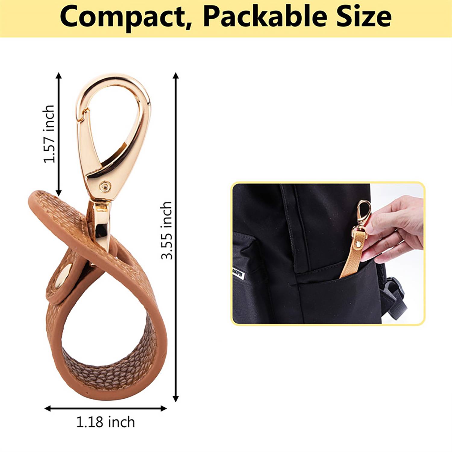 Durable PU leather hat clip with metal clasp, ideal for travel. Keeps hats secure, saves space, doubles as a keychain.