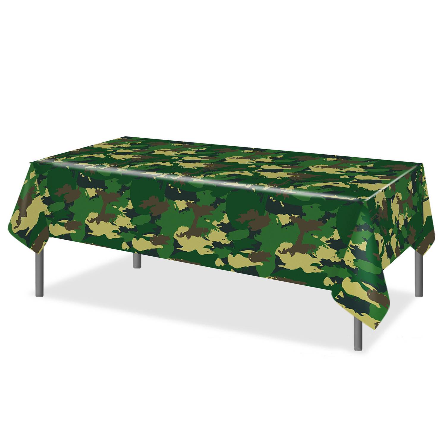 Durable plastic camouflage tablecloth, waterproof, easy to clean, perfect for parties, birthdays, and outdoor use.