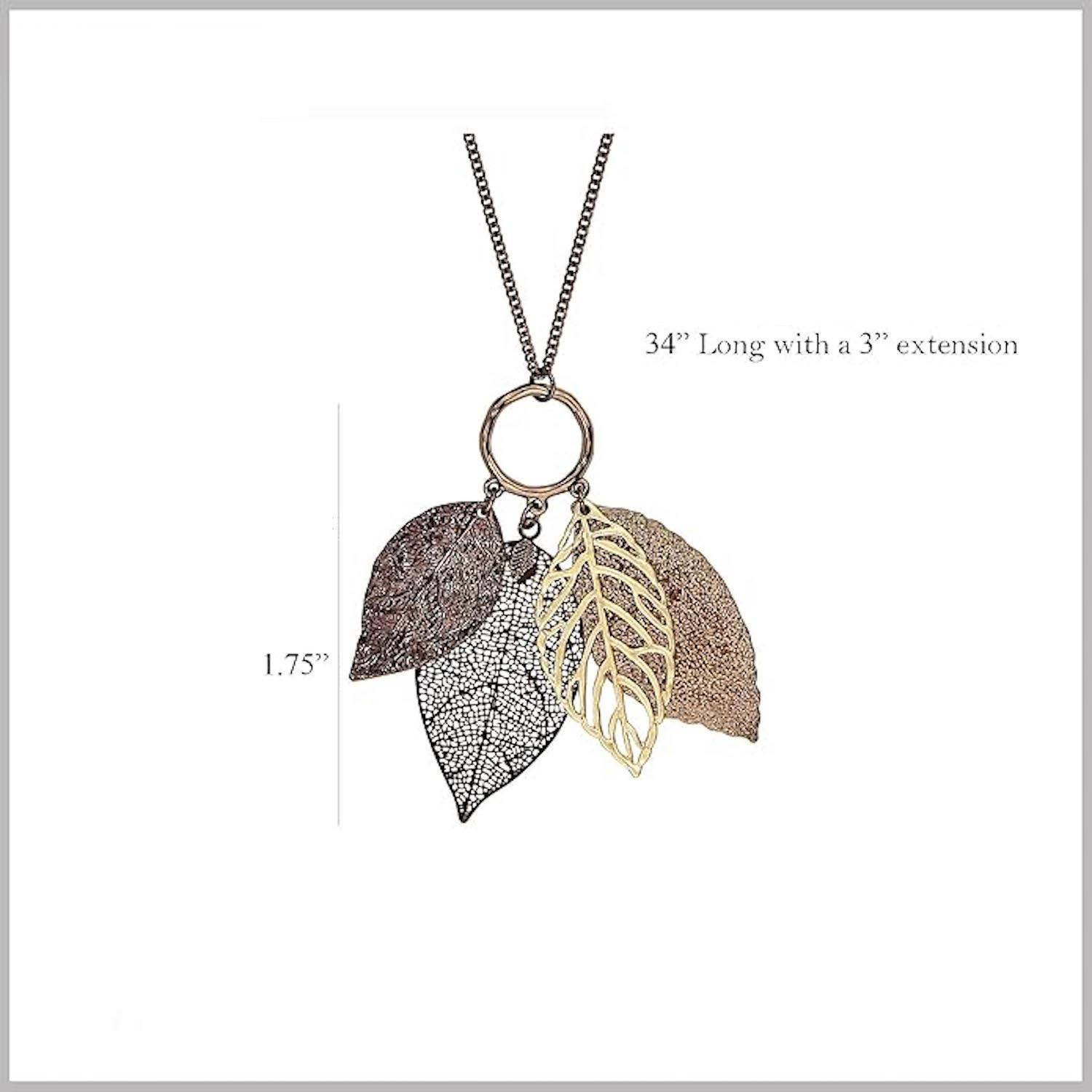 Stylish long leaf pendant necklace, versatile with Chocolate Gold/Worn Gold plating, ideal for everyday wear.