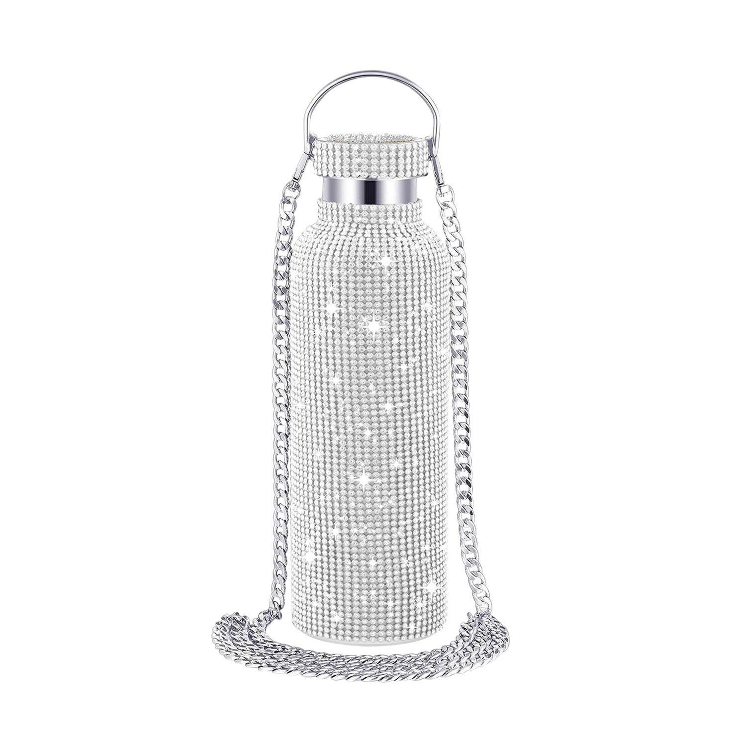 Shiny diamond-studded 17oz stainless steel thermos, durable, reusable, keeps drinks hot or cold. Ideal for gifts.