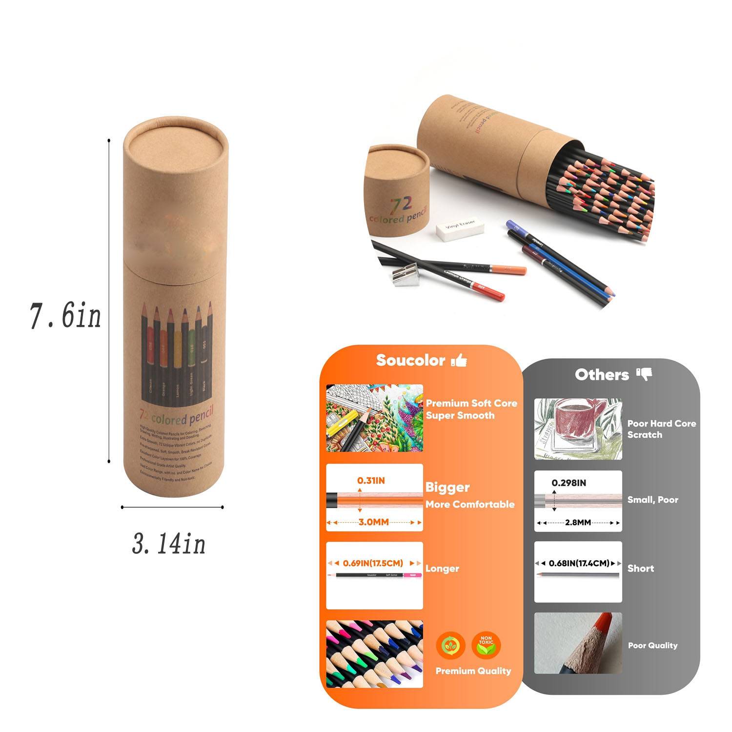 72-Color Colored Pencils: vibrant pigments, smooth application, 2.9″x2.9″x7.6″.