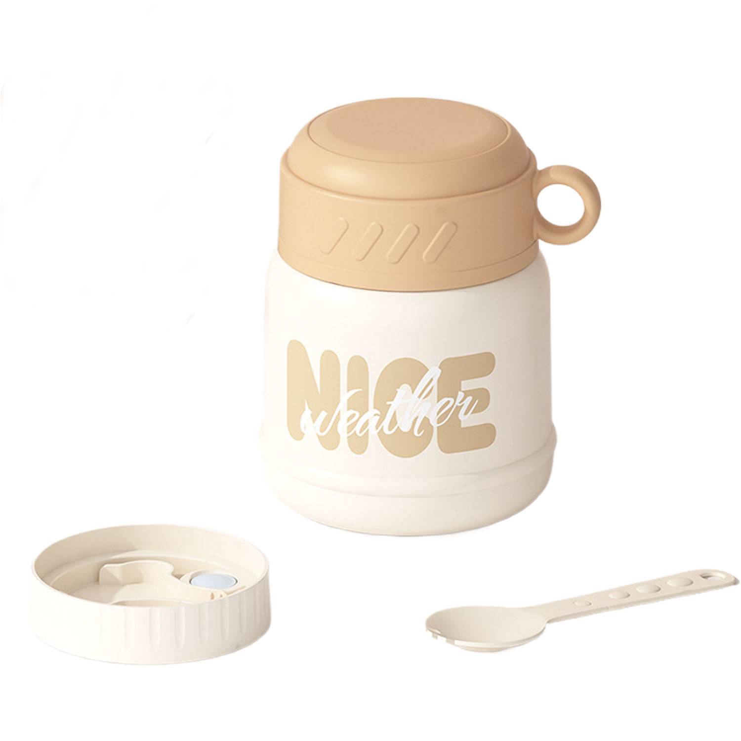 Durable plastic and stainless steel cup with spill-proof lid, foldable spoon, and BPA-free design.