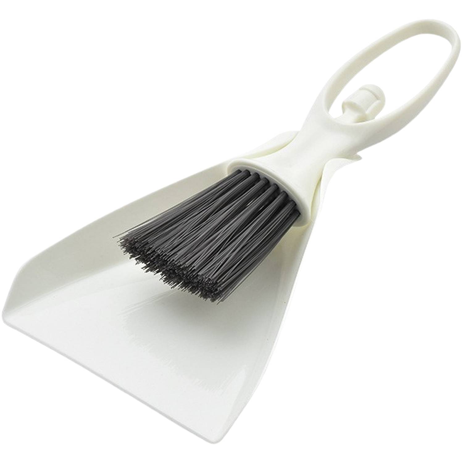 Compact plastic cleaning set with mini brush and dustpan, sweeps crumbs and dust from desks, keyboards, and drawers.
