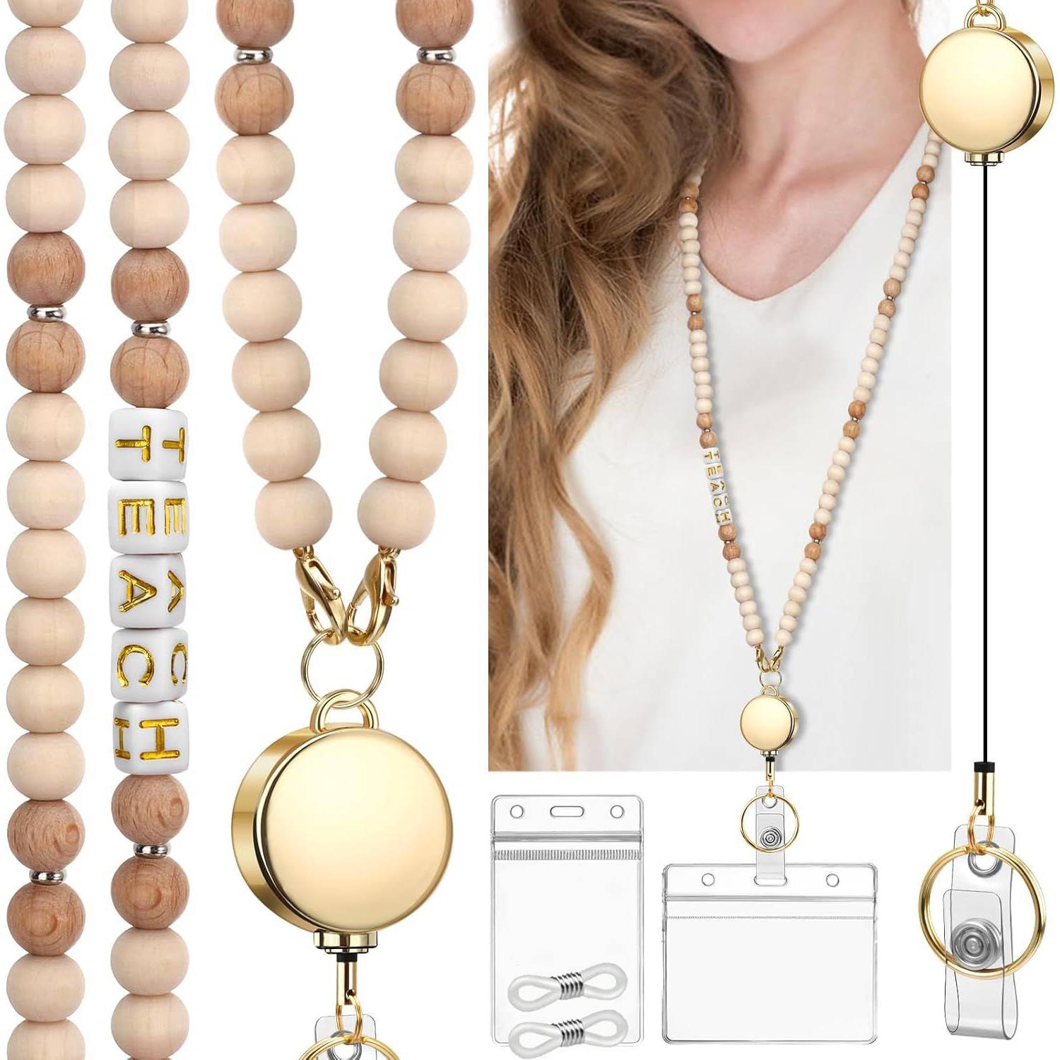 Wooden Bead Zipper Pull Retractable Lanyard Set