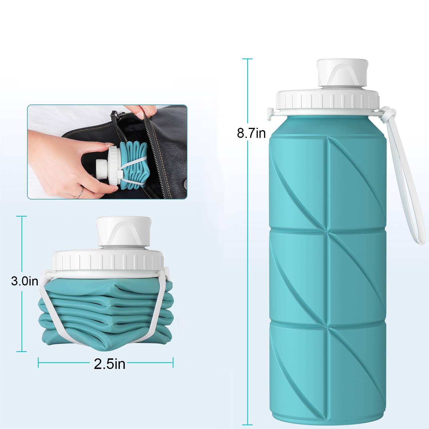 23oz BPA-free silicone collapsible water bottle, leak-proof, lightweight, perfect for hiking, gym, camping, and daily hydration.