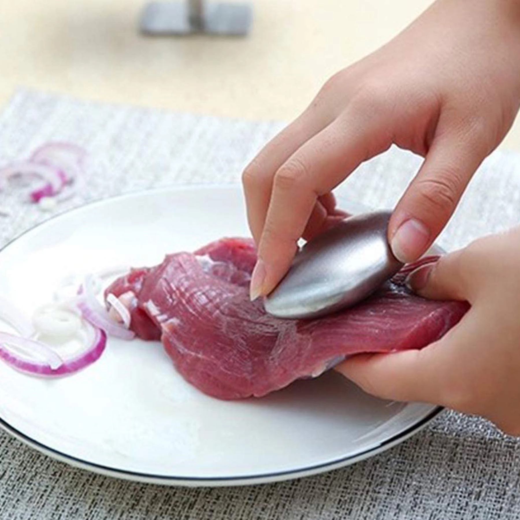 Stainless steel bar of soap that removes odors from hands.