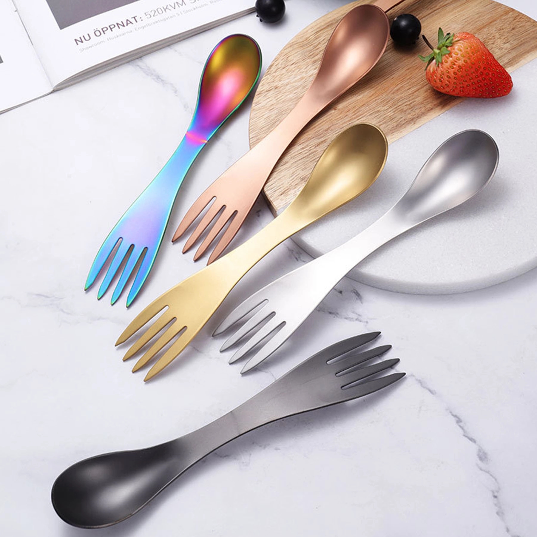 Stainless steel spork – designed with a spoon on one end and a fork on the other end.