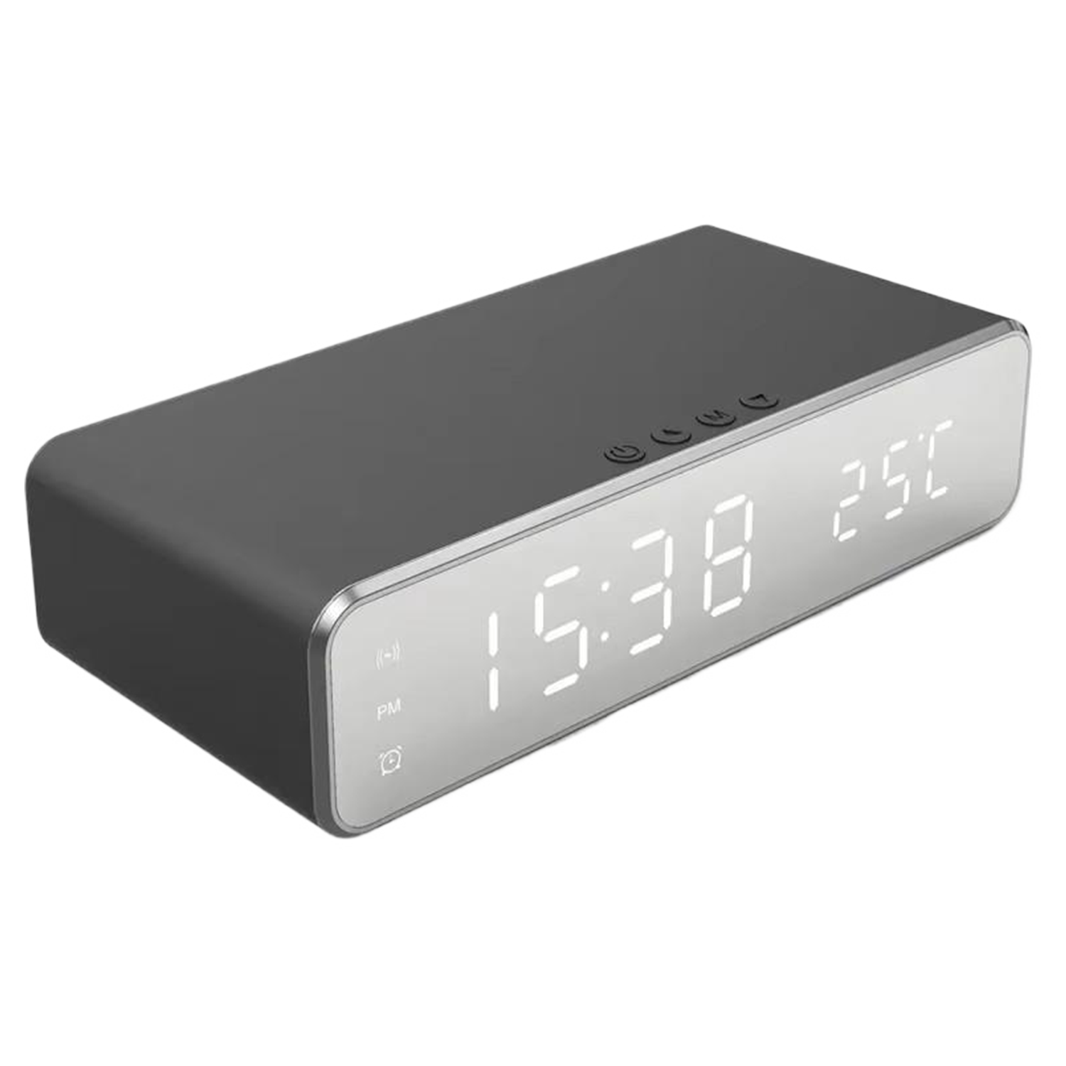 This ABS desktop device is an LED mirror clock showing time and temperature. It functions as a wireless charger and alarm clock.