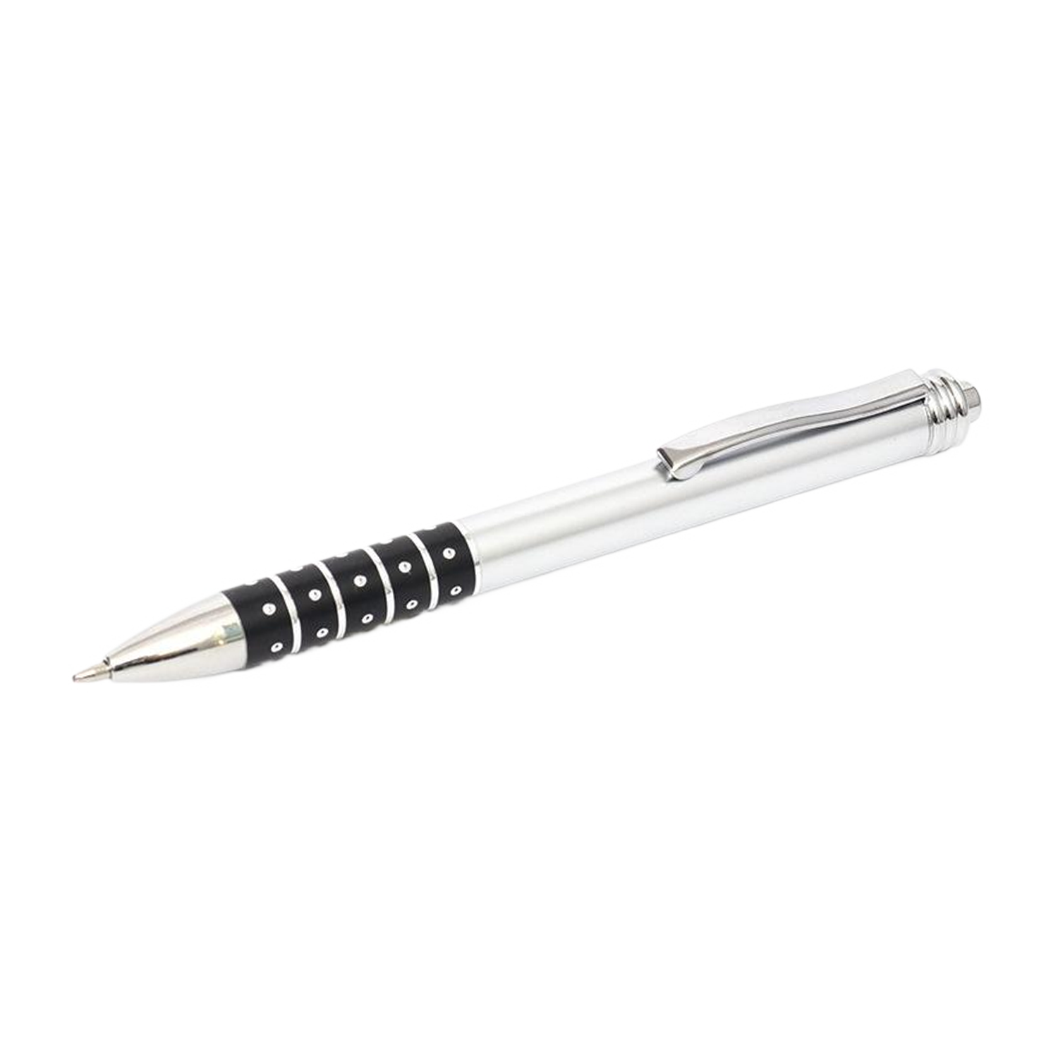 A plastic retractable ballpoint pen with a silver finish,silver plated clip,and a textured ring grip.Suitable for smooth writing.