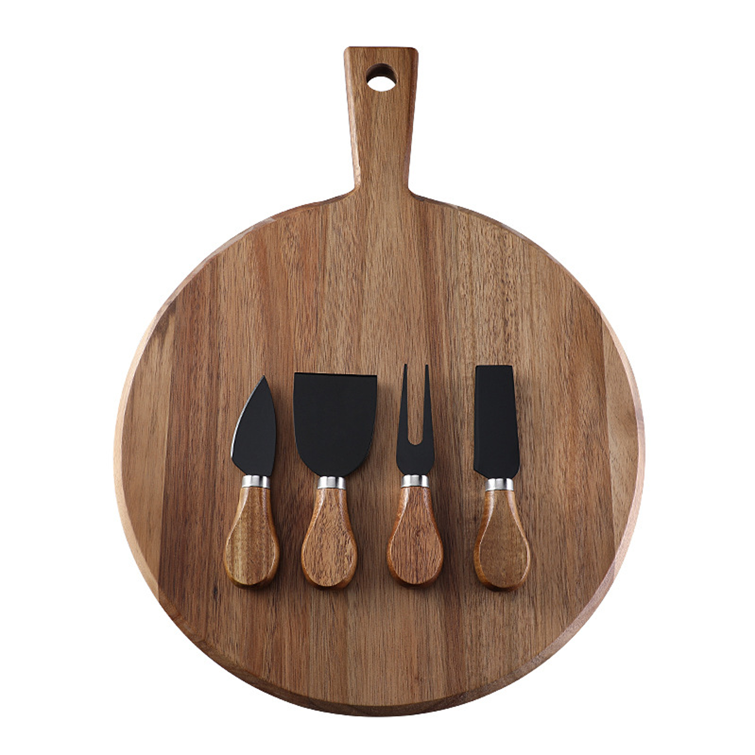 A solid wood round cheese board set with four stainless steel utensils.Includes specialized knives and a fork for serving cheeses.