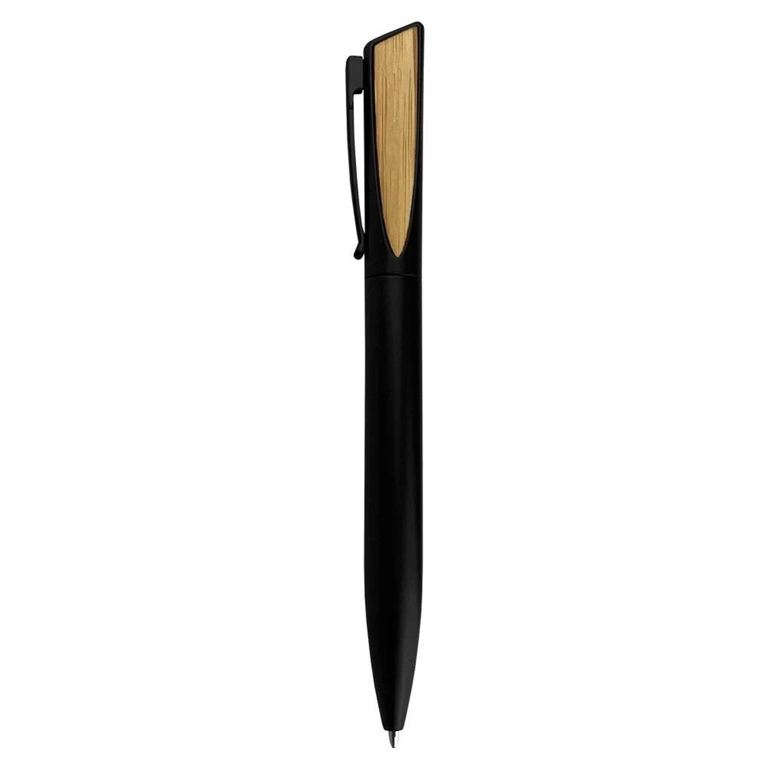 Stainless steel ballpoint pen with bamboo inlay twist mechanism and clip for smooth writing in office, school, or daily use.