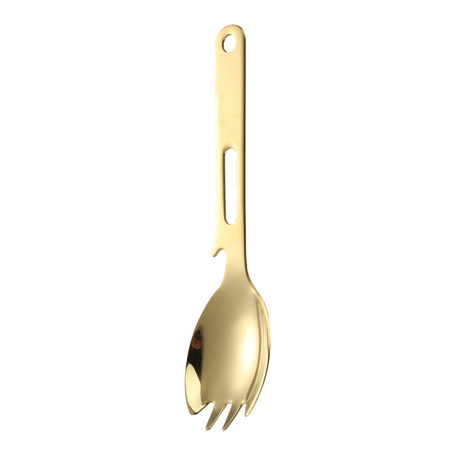 4-in-1 stainless steel spork with fork, spoon, cutter, and bottle opener; safe, durable, and perfect for outdoor dining.
