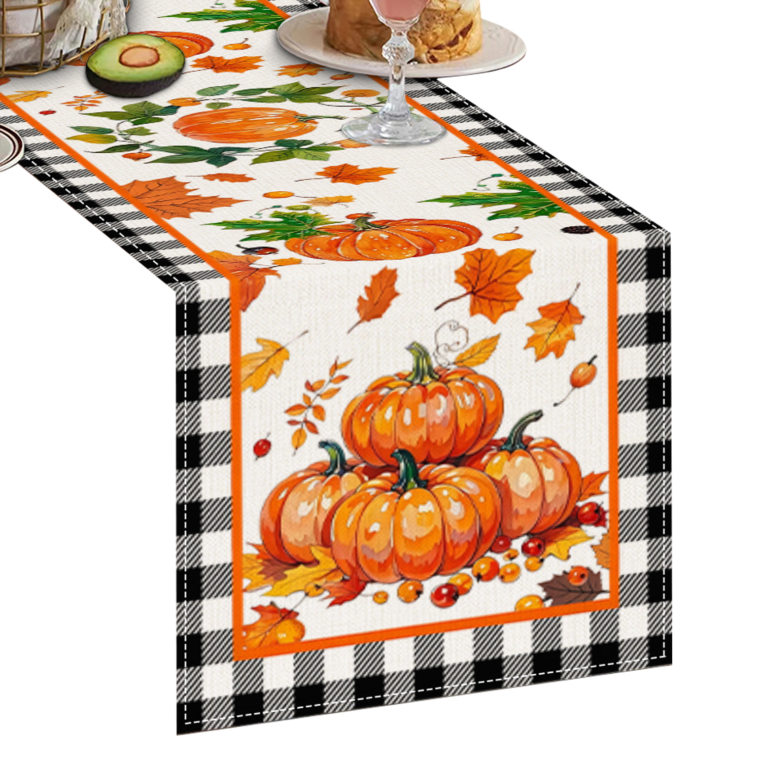 Linen tablecloth with pumpkin print. Heat and stain resistant for table protection. Durable, colorfast, and safe for food contact.