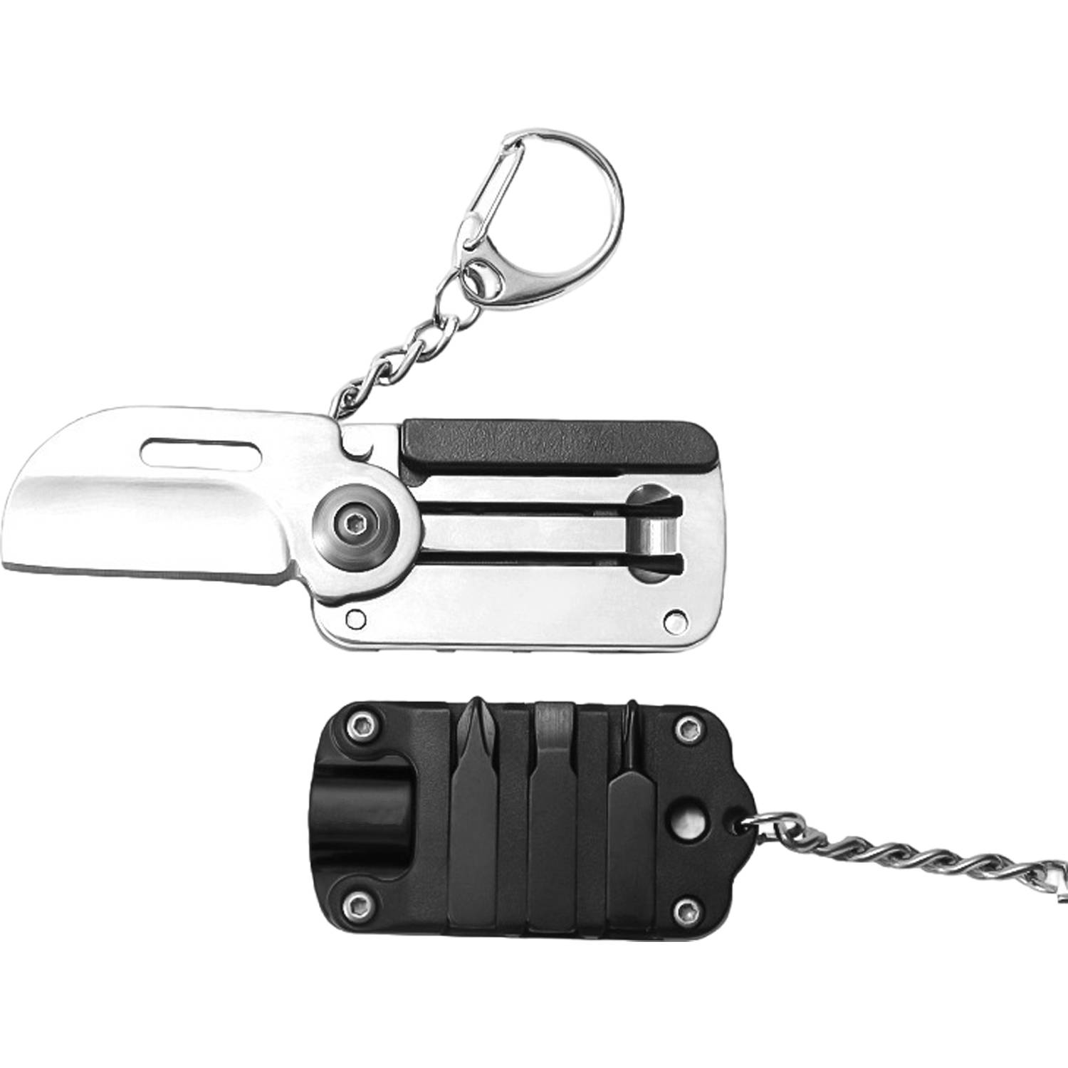 Stainless steel dog tag multi-tool keychain with knife, screwdrivers, and bottle opener, compact for hiking, camping.