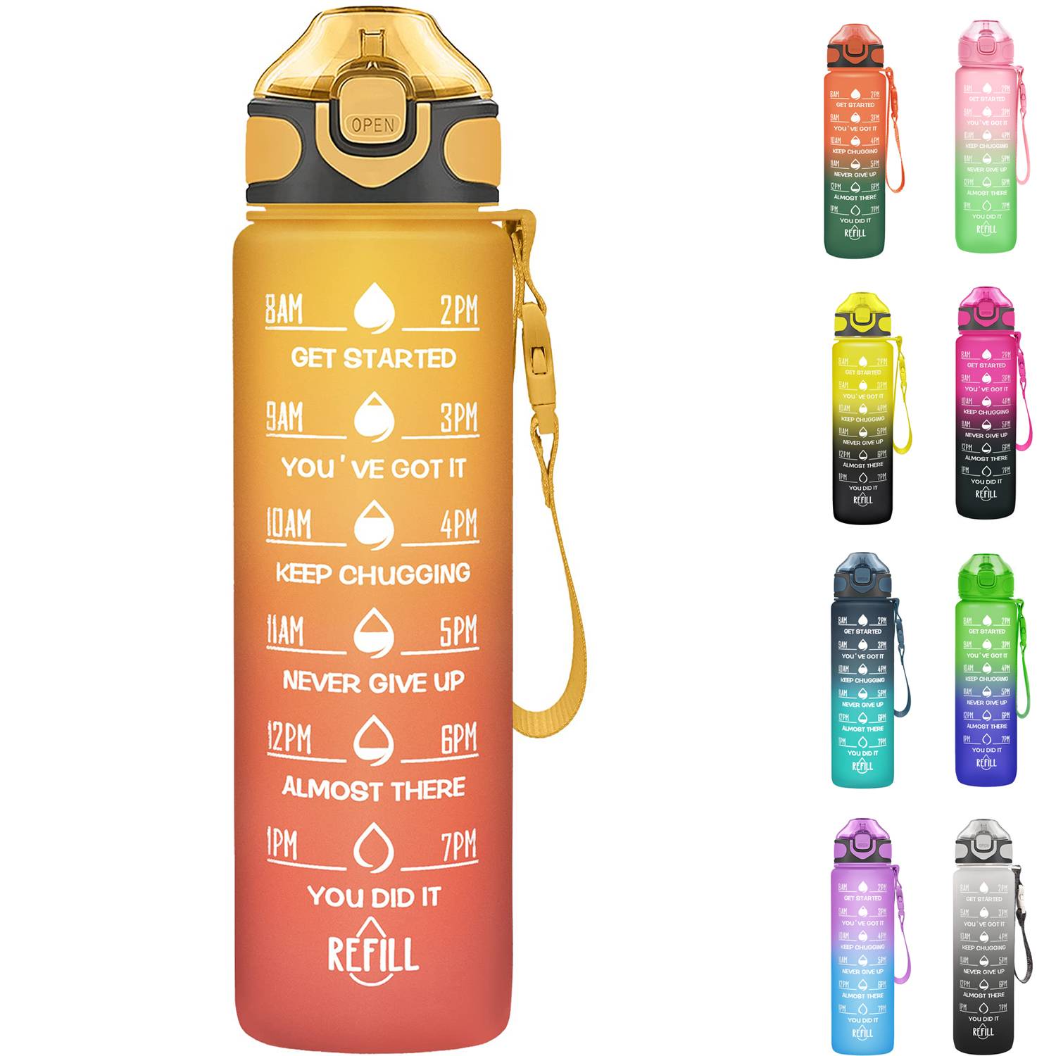 BPA-free bottle with time markers, straw, strap, and leakproof lid; ideal for active use, hot or cold drinks, all-day hydration.