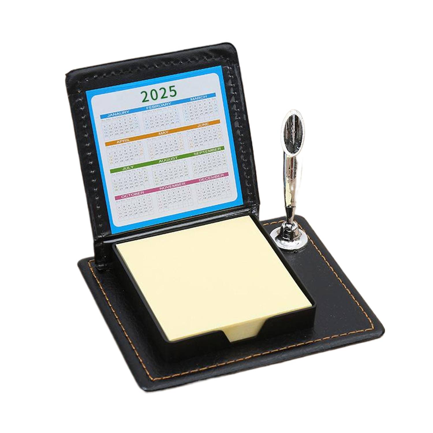 100 colorful sticky notes with pen holder & calendar in stylish PU leather case.