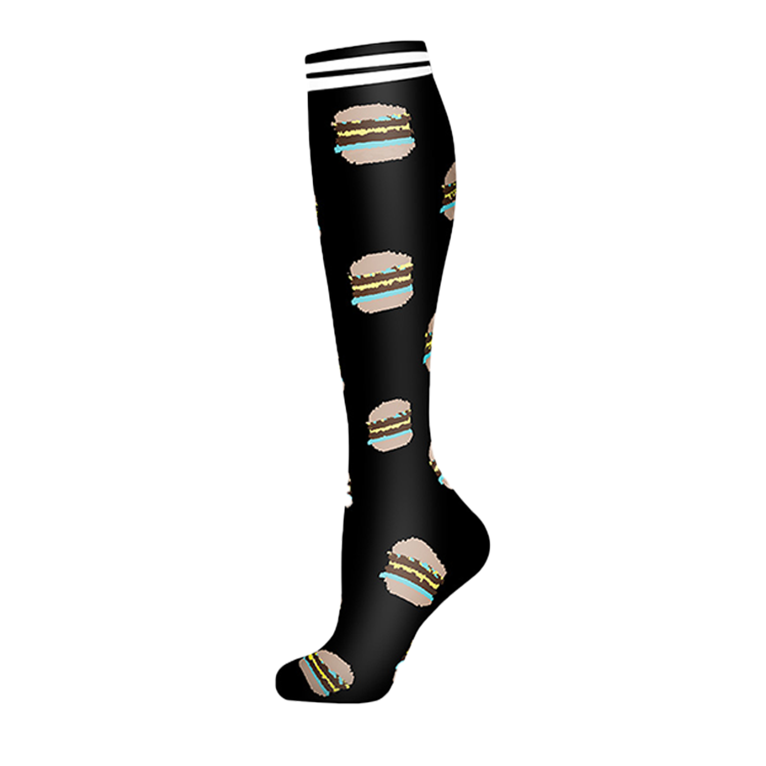 Polyester compression socks with non-slip grip and moisture control. Arch support cushioning for running sports comfort.