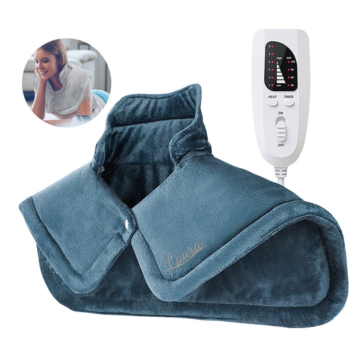Soft fleece electric heating pad provides soothing warmth and pain relief for neck, back, and shoulders.