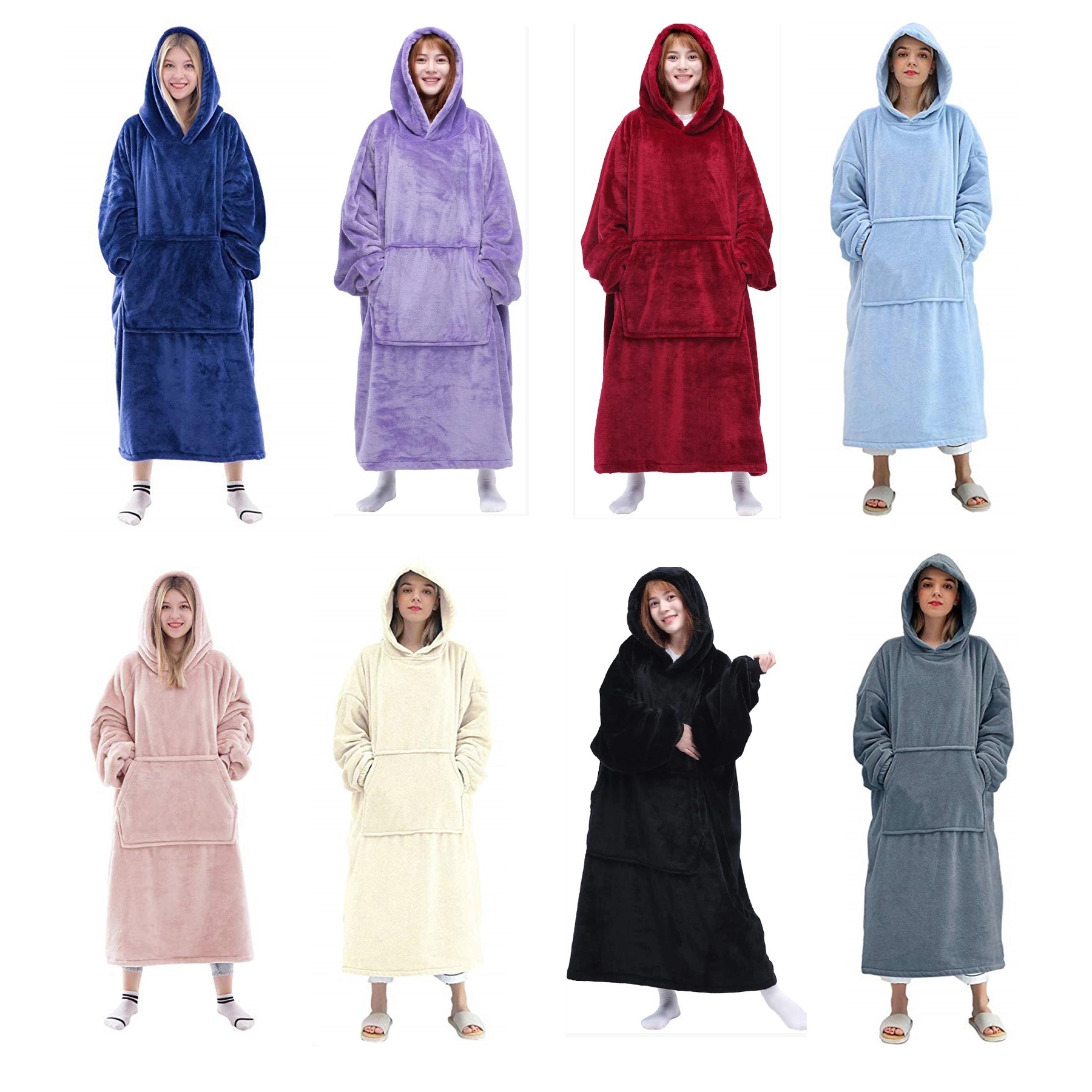 Wearable blanket with sleeves, hood, pockets and multiple size options.
