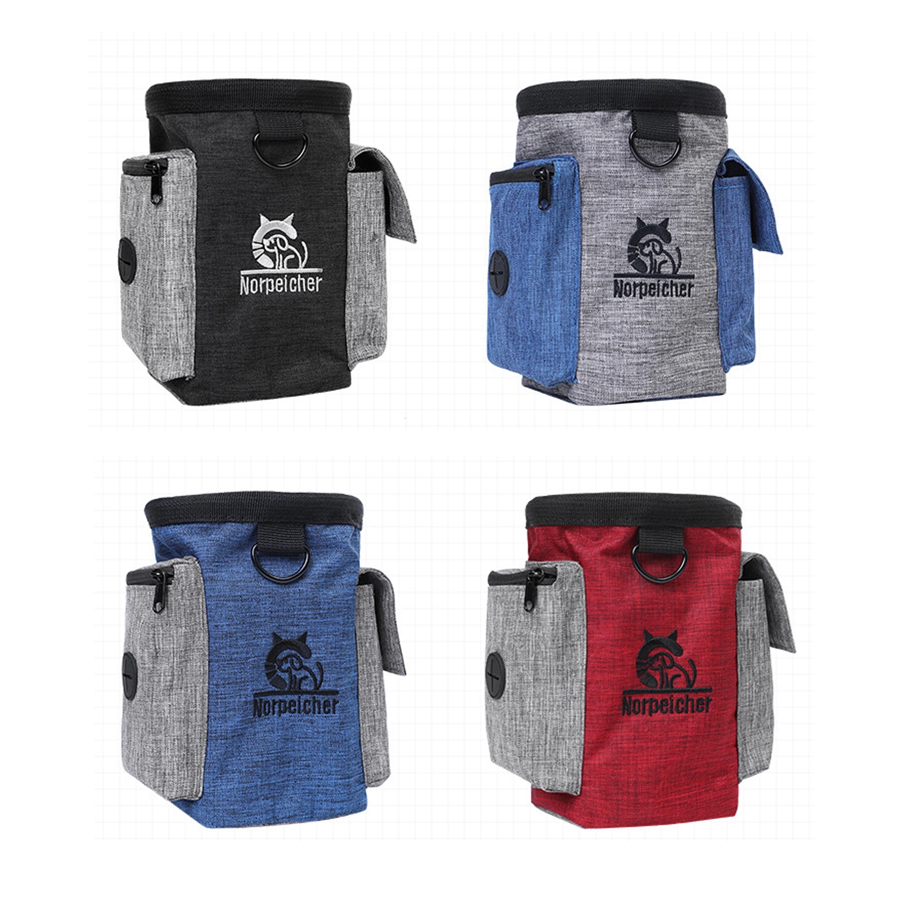 3.9″ x 3.9″ x 6.5″ dog training pouch with a drawstring, built-in waste bag holder an adjustable waistband, and more.