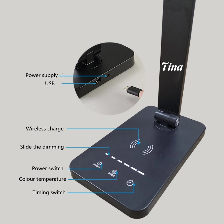 This lamp has wireless charging and USB charging functions. You can charge your mobile phone while working, studying.