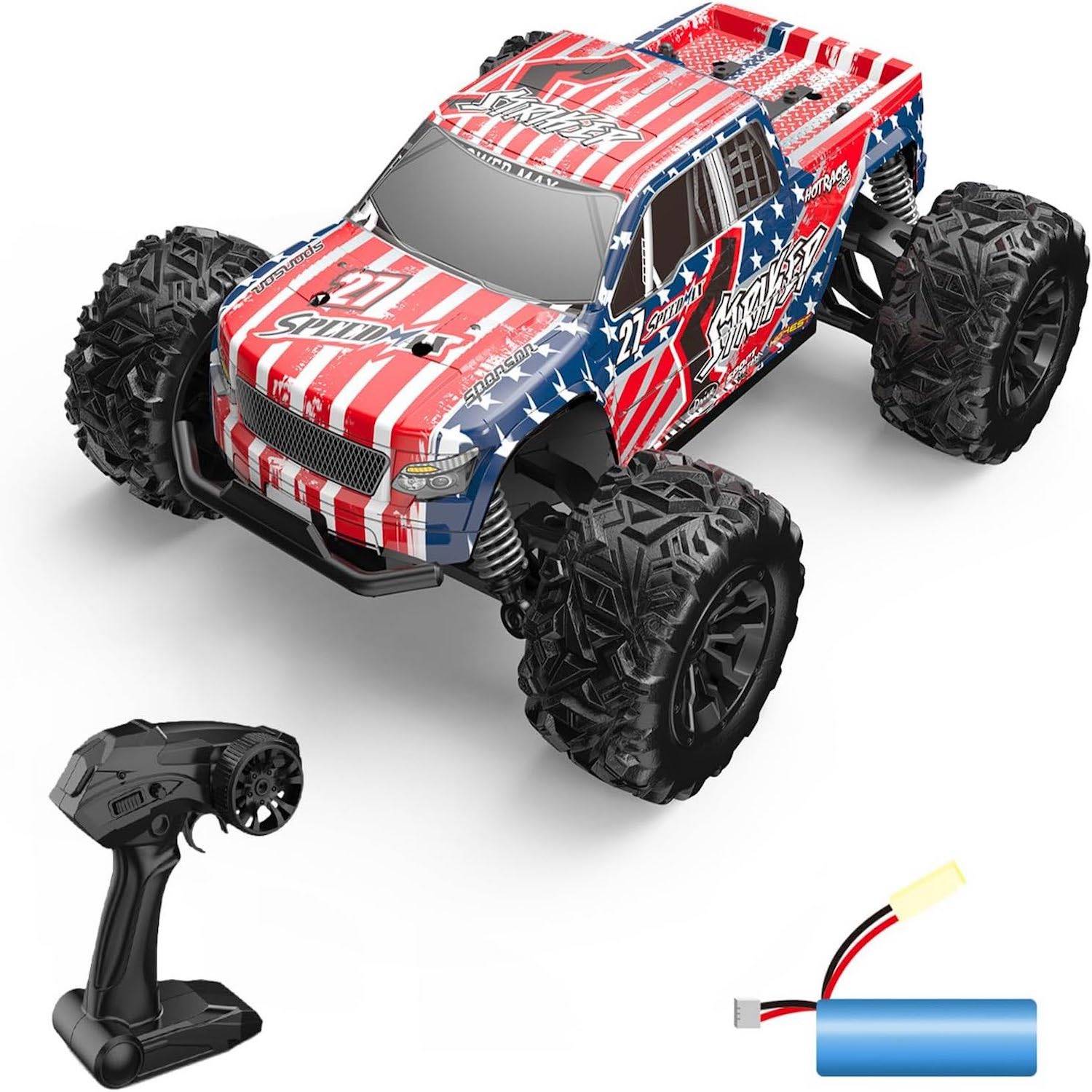 This remote-control car offers precise handling, 4WD power, 20km/h speed, long battery life, and wear-resistant tires.