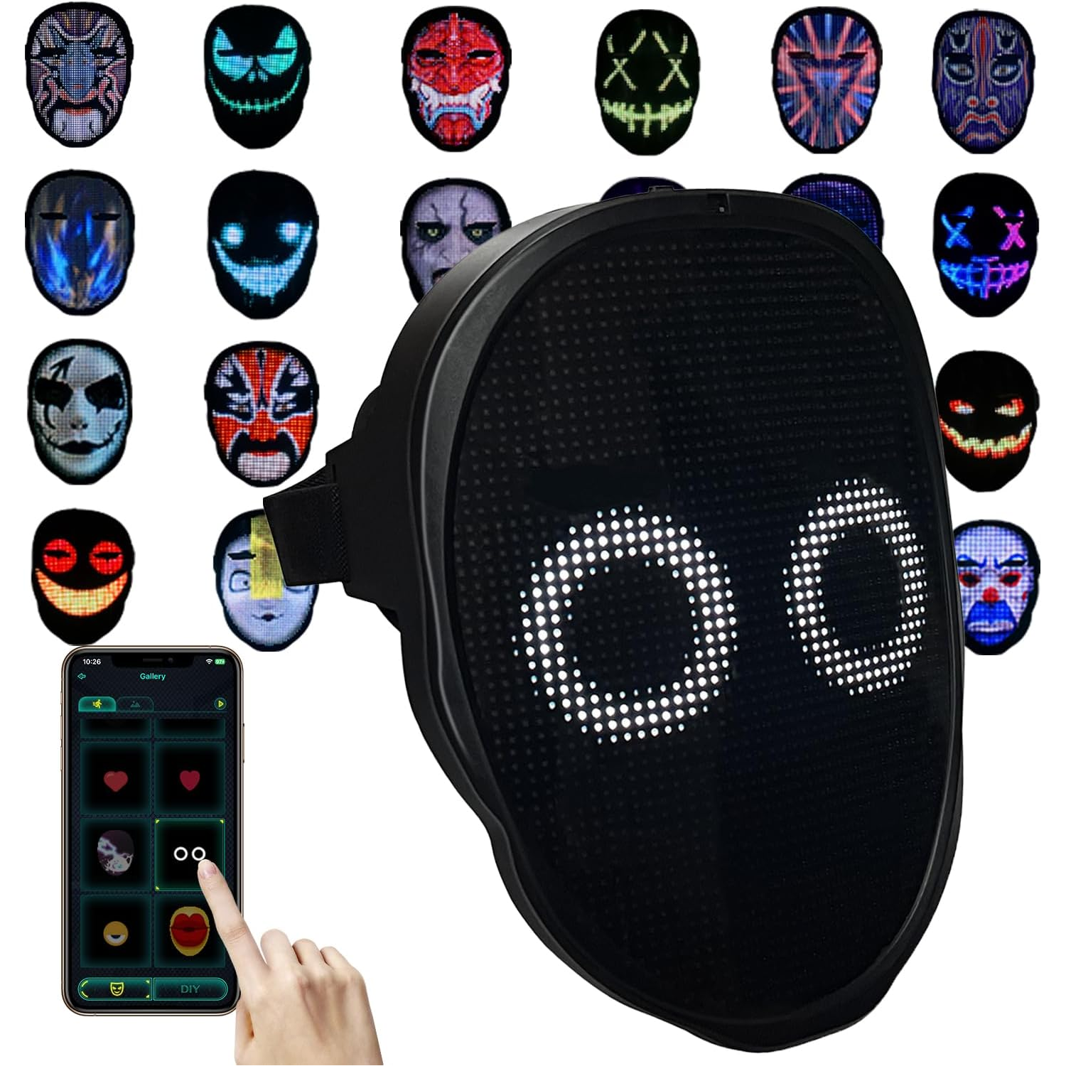 Shining Mask with 2074+2121 LED beads charges in 5hrs (USB TYPE-C) for 12hrs use. Offers 45 dynamic & 70 static modes.