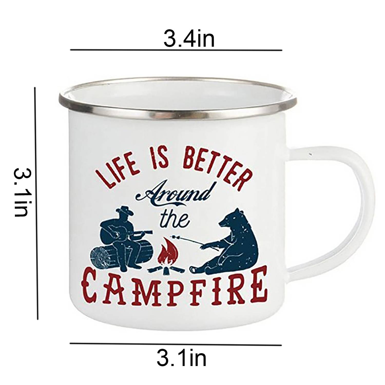 Durable 13oz enamel mug with stainless steel rim, customizable design, perfect for home, camping, and travel. Hand wash only.