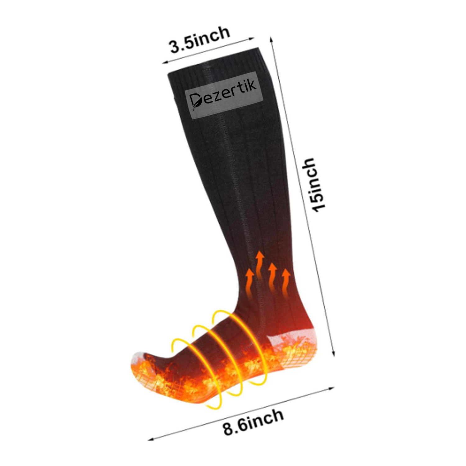 Pure cotton, ergonomic heated socks, latest heating tech, rapid toe warming, ideal for outdoor warmth & comfort.