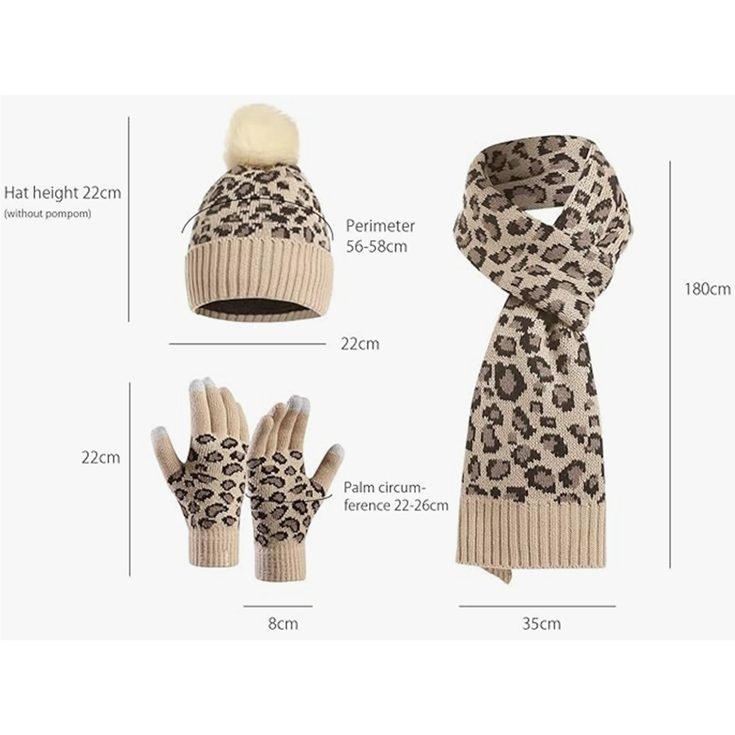 Leopard Print Warm Wool Knitted Hat, Scarf and Gloves Set