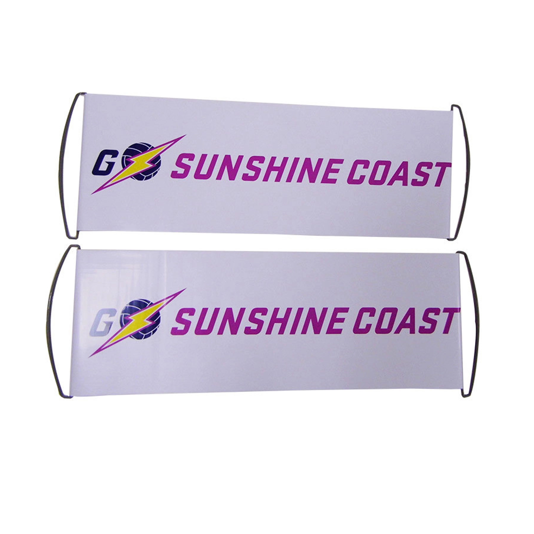 This handheld banner can extend to 9.5″ x 27″ banner and roll itself up to 9.5″ x 2″.