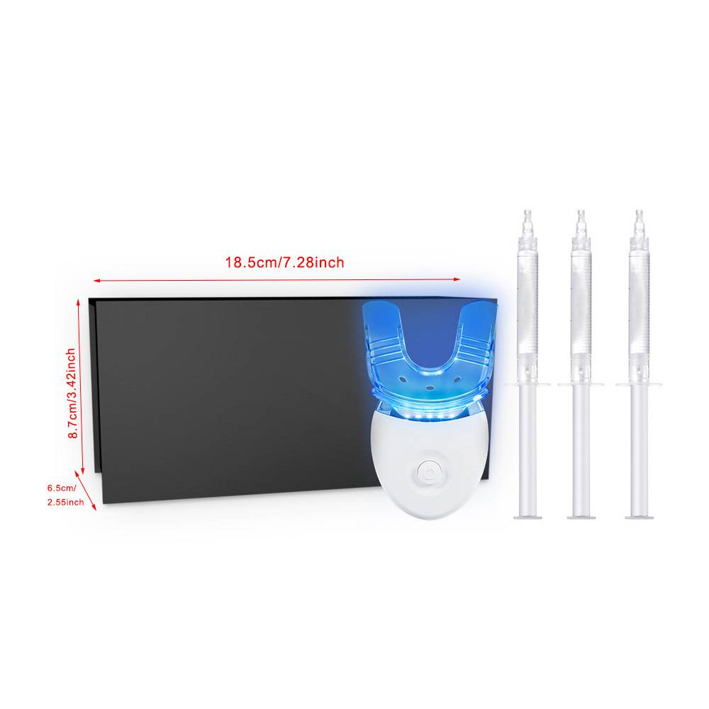 Teeth whitening kit with 35% carbamide peroxide gel and 5 LED bulbs removes stains from coffee and smoking in 30-minute sessions.