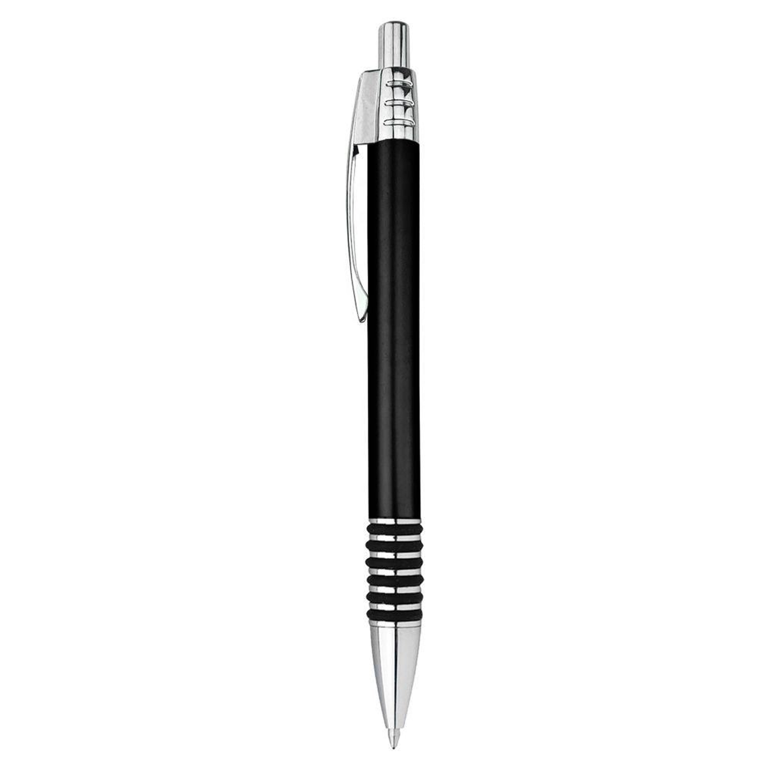 A metal retractable ballpoint pen with a six-ring rubber grip and chrome details. The click mechanism and clip offer convenience.