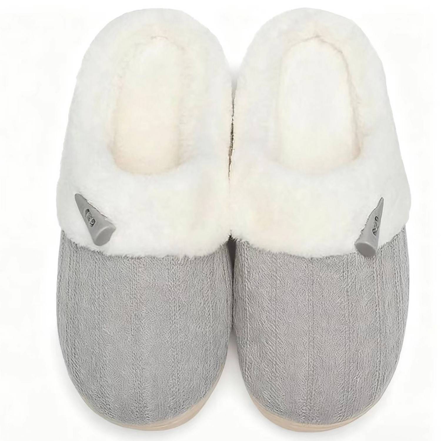 These knit slippers with horn button details offer comfort, warmth, and stability for cozy indoor wear.