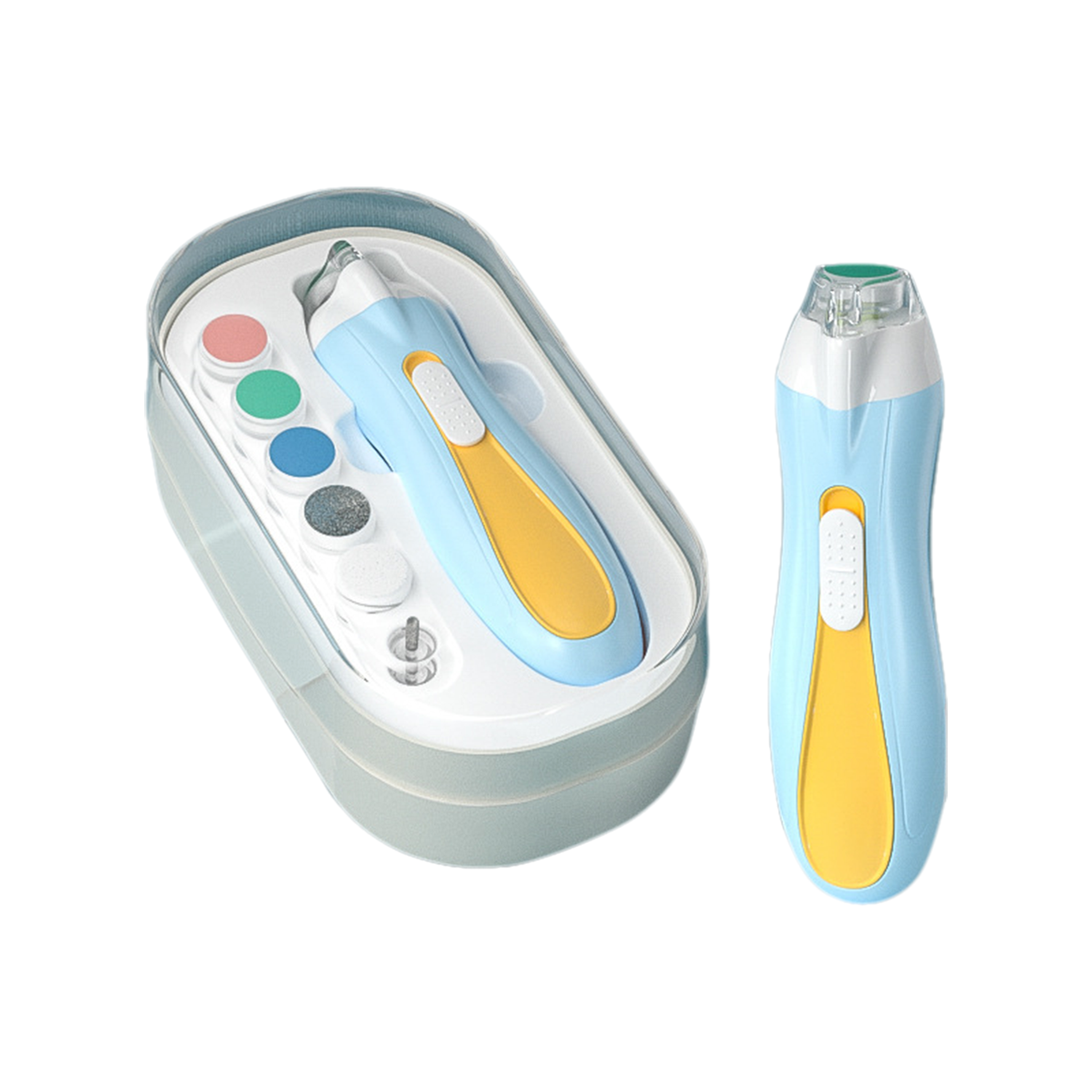 A quiet rechargeable nail file for babies. It has a soft light and multiple heads for safe trimming. Ideal for nail care at home.