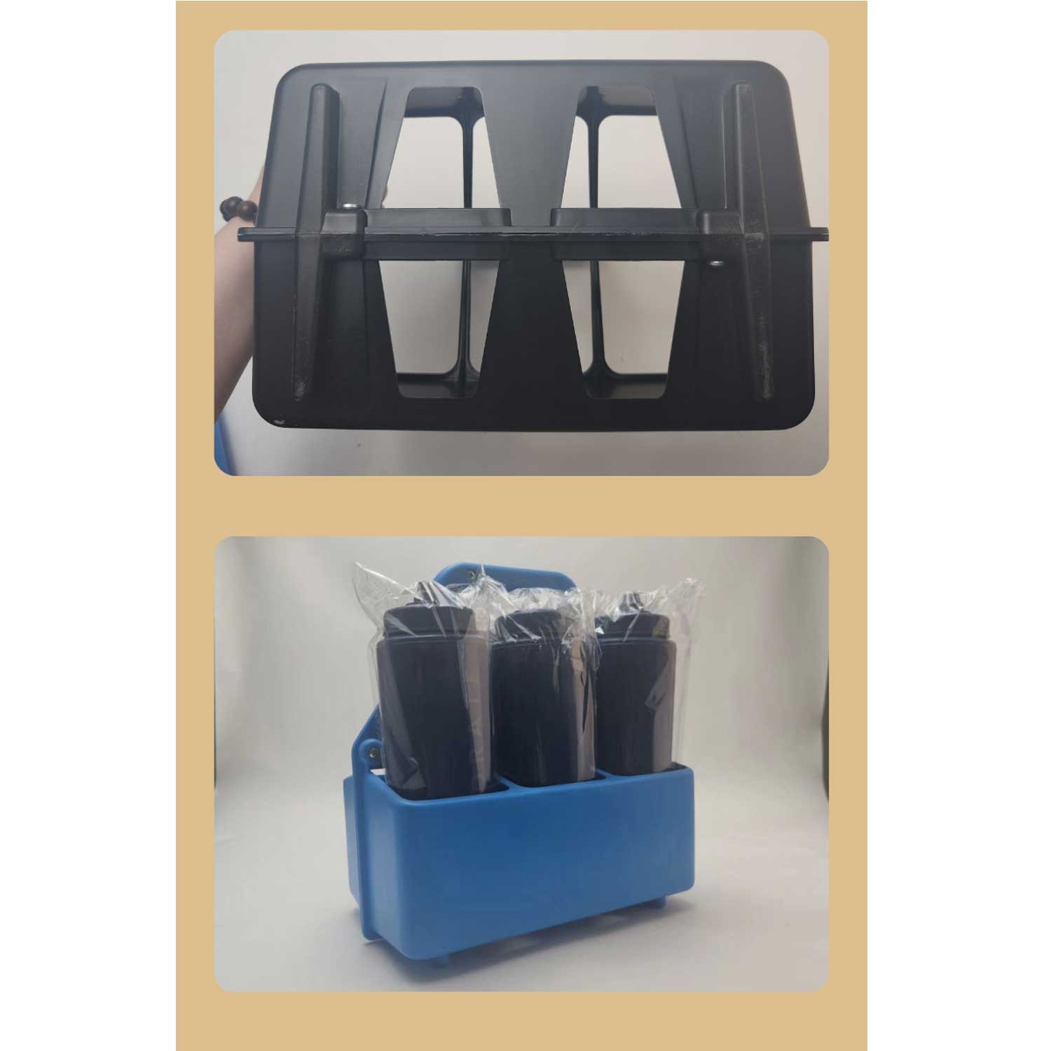 6 bottle sports carrier thick plastic, customizable colors/logo. Ventilated base, sturdy handle. Perfect for teams/gyms.