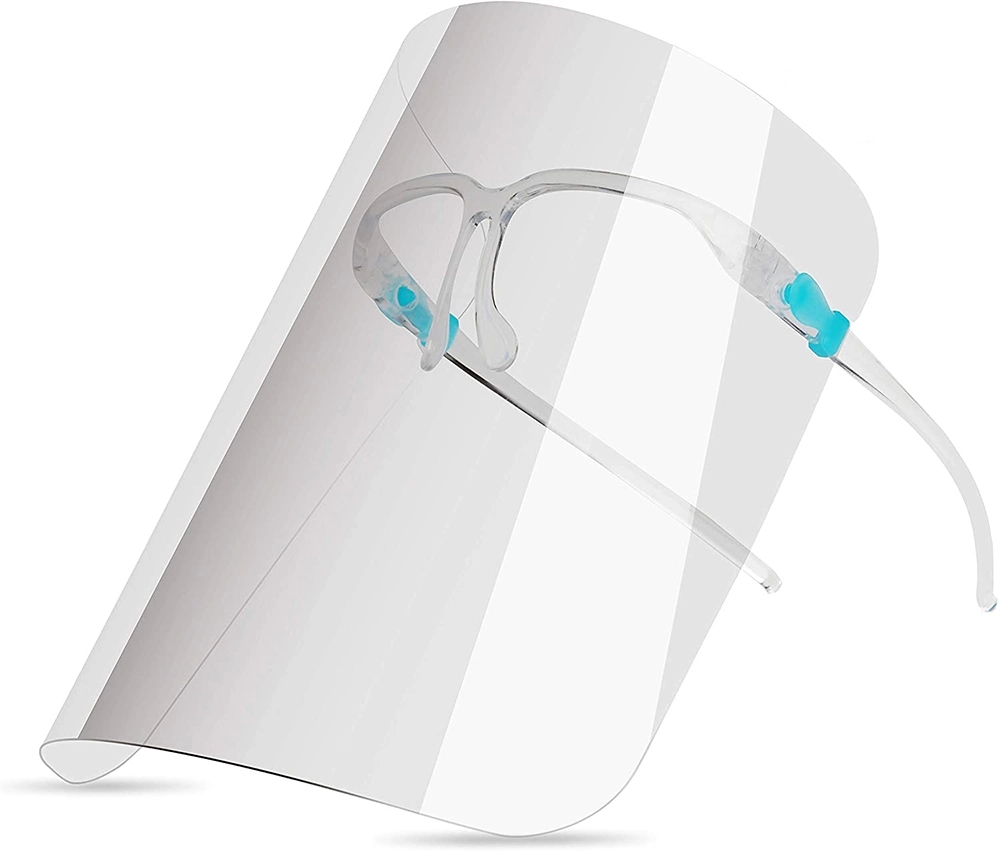 Face shield with glasses frames to prevent saliva, dust, smoke, and airborne germs from flying into your face.