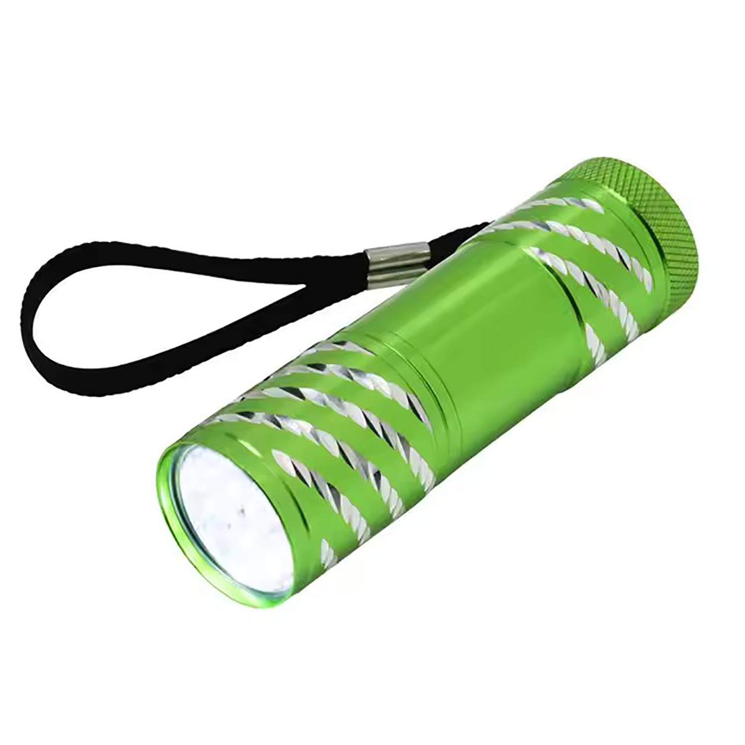 9-LED aluminum flashlight 50 lumens, 3 AAA. IPX4 water-resistant, anti-slip grip, compact for camping/daily use.