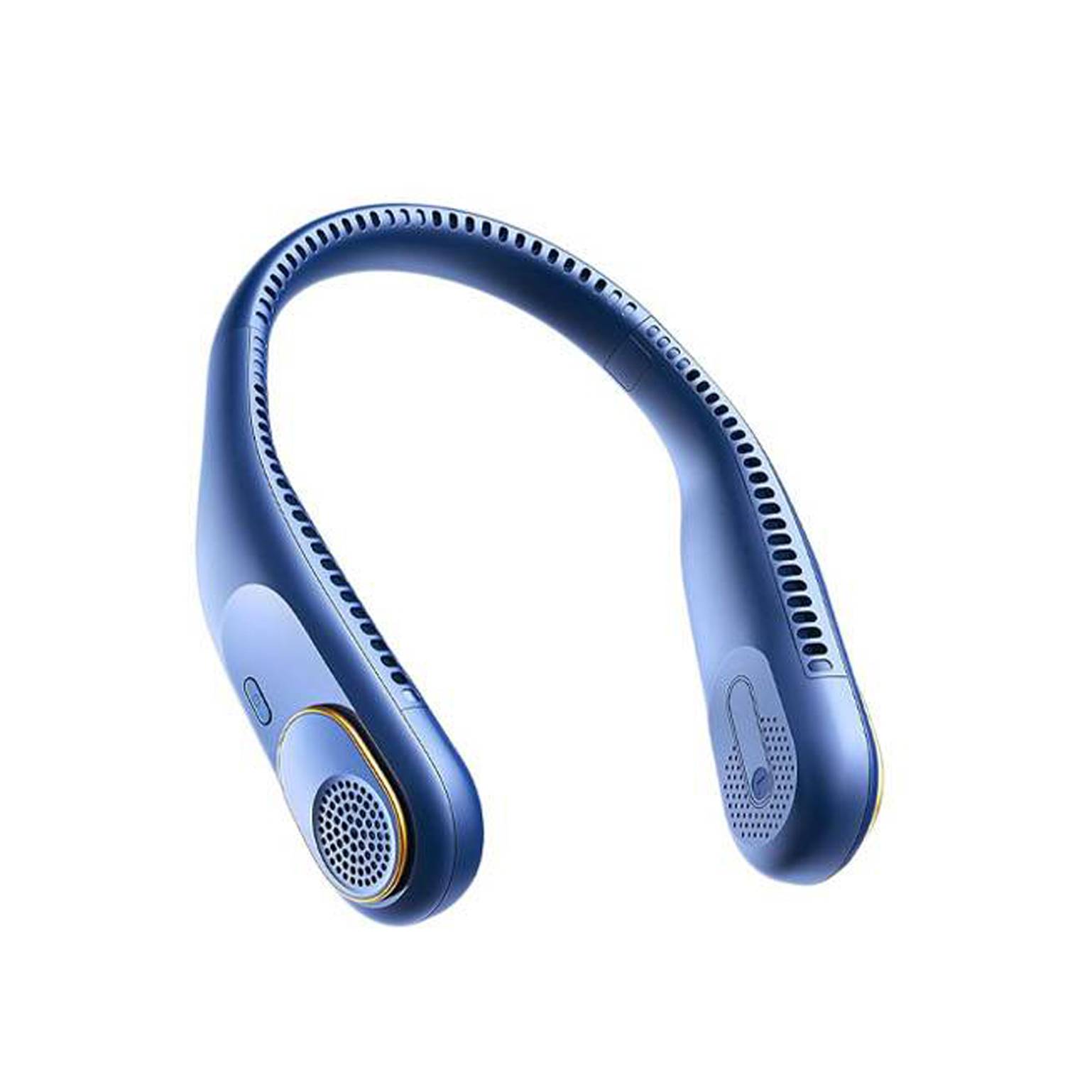 USB rechargeable neck fan, bladeless safe design, lightweight soft material, quiet powerful airflow, perfect for outdoor travel.