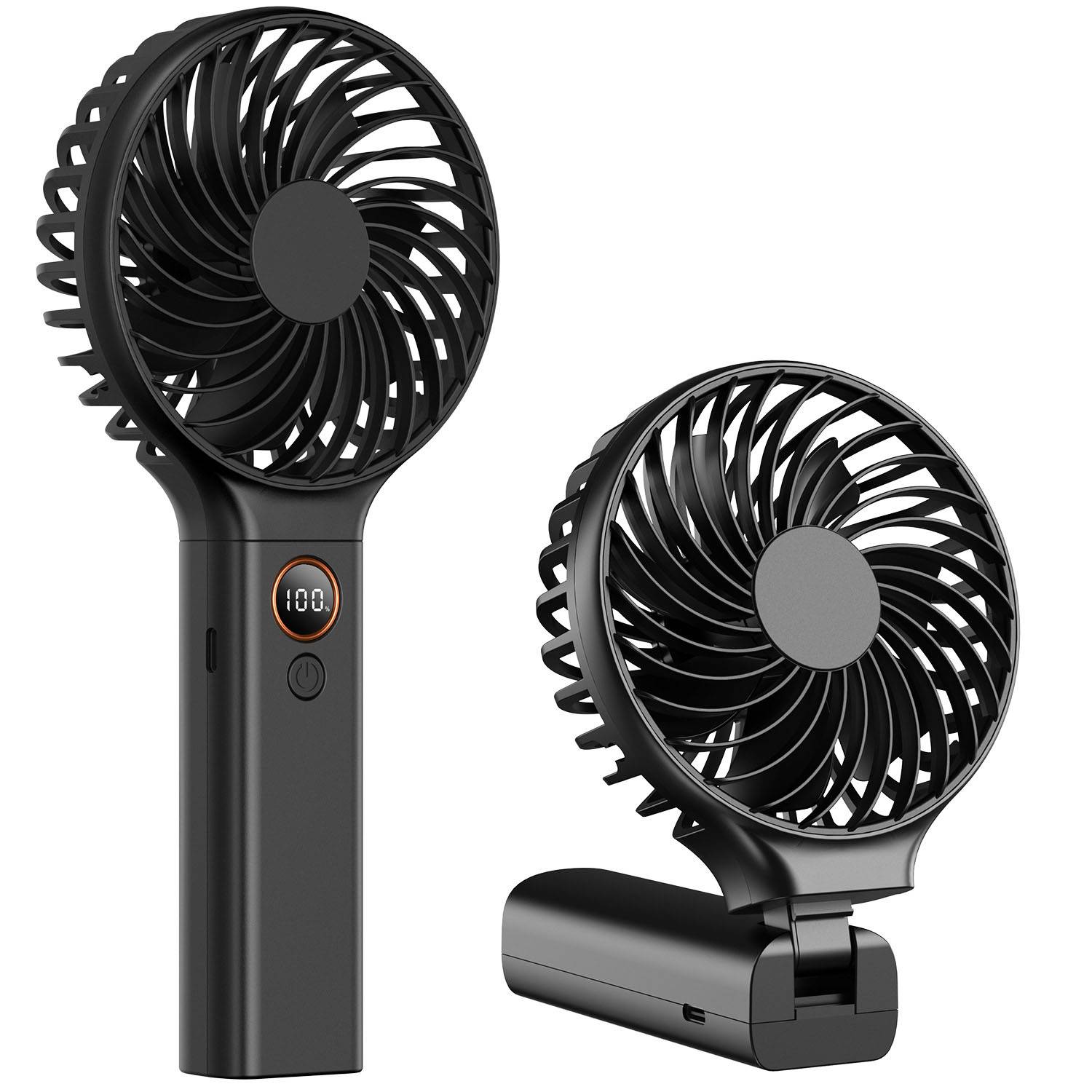 Portable plastic handheld fan with 6 speeds, LED display, quiet 15dB motor, 5000mAh battery, foldable design.