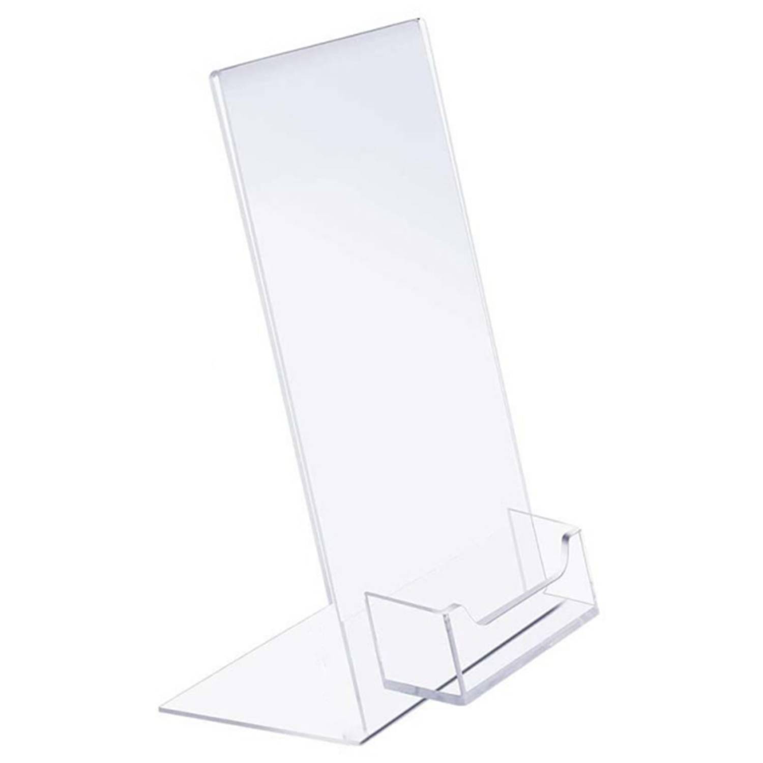 Durable acrylic holder with tilted stand, clear display, safe edges, and smooth use, ideal for offices and trade shows.