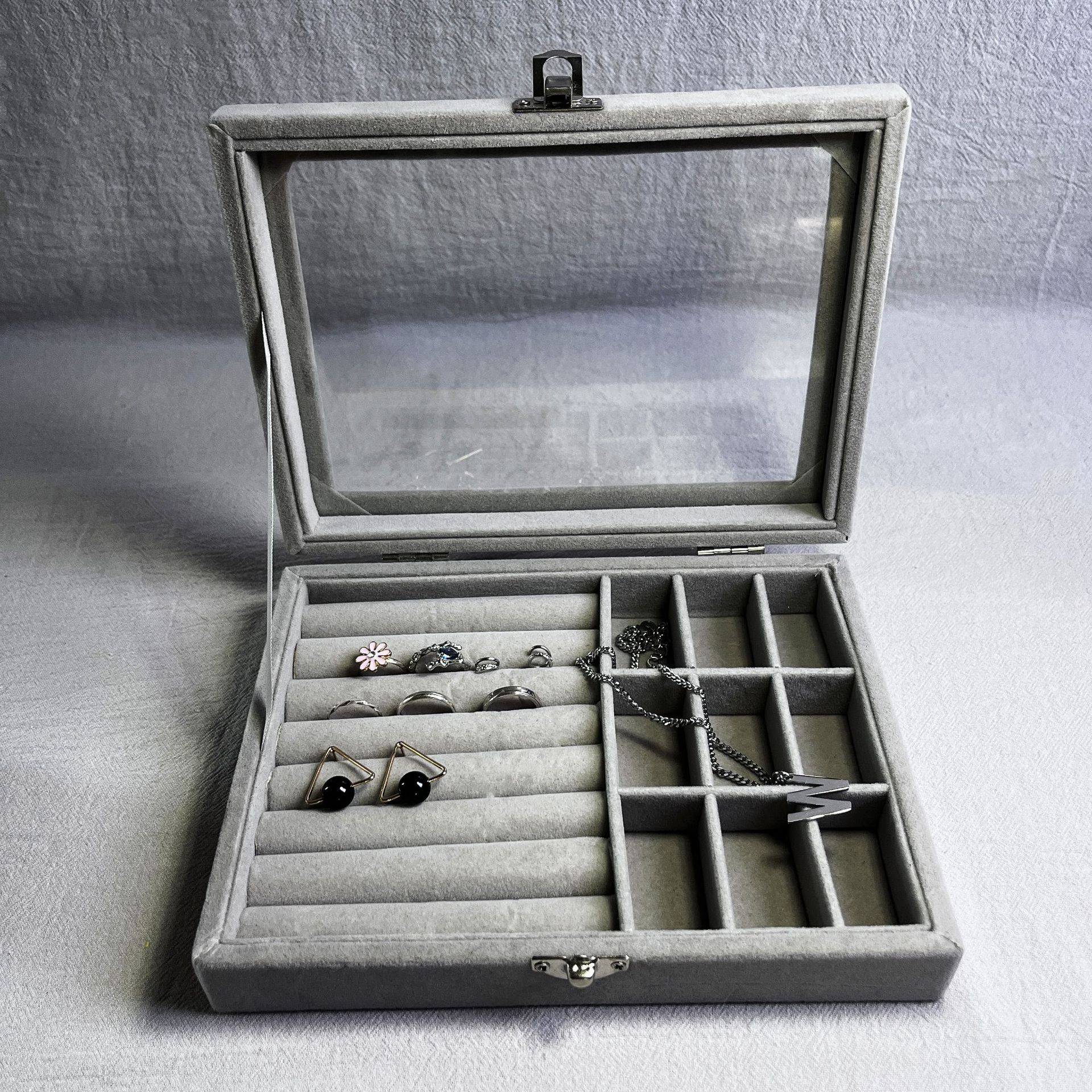 Elegant Large Capacity Jewelry Holder: 9 grids, 8 ring slots, clear glass lid, high-quality materials, and a perfect gift choice.