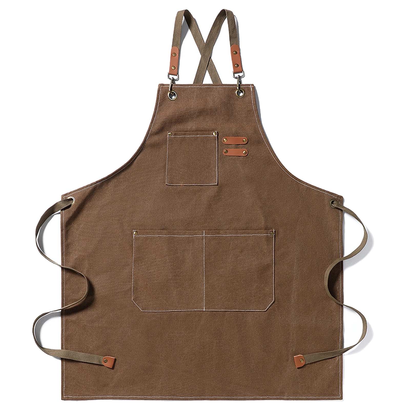 Durable canvas apron with multiple pockets, cross-back straps, and comfort fit, ideal for woodworking, grilling, or crafting.