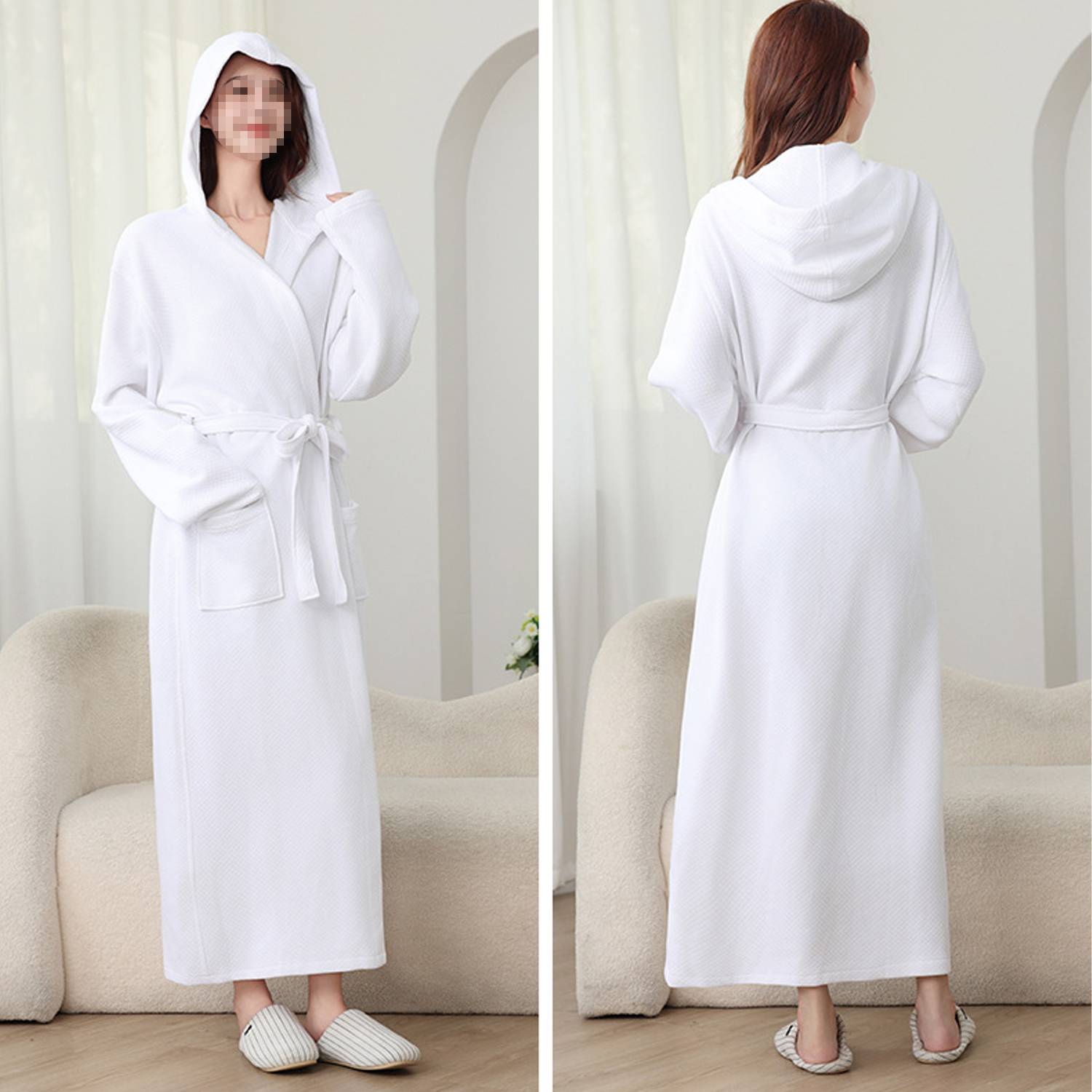 Women’s long hooded cotton bathrobe. Soft, absorbent, and perfect for spa, home, and hotel use. Available in six colors.